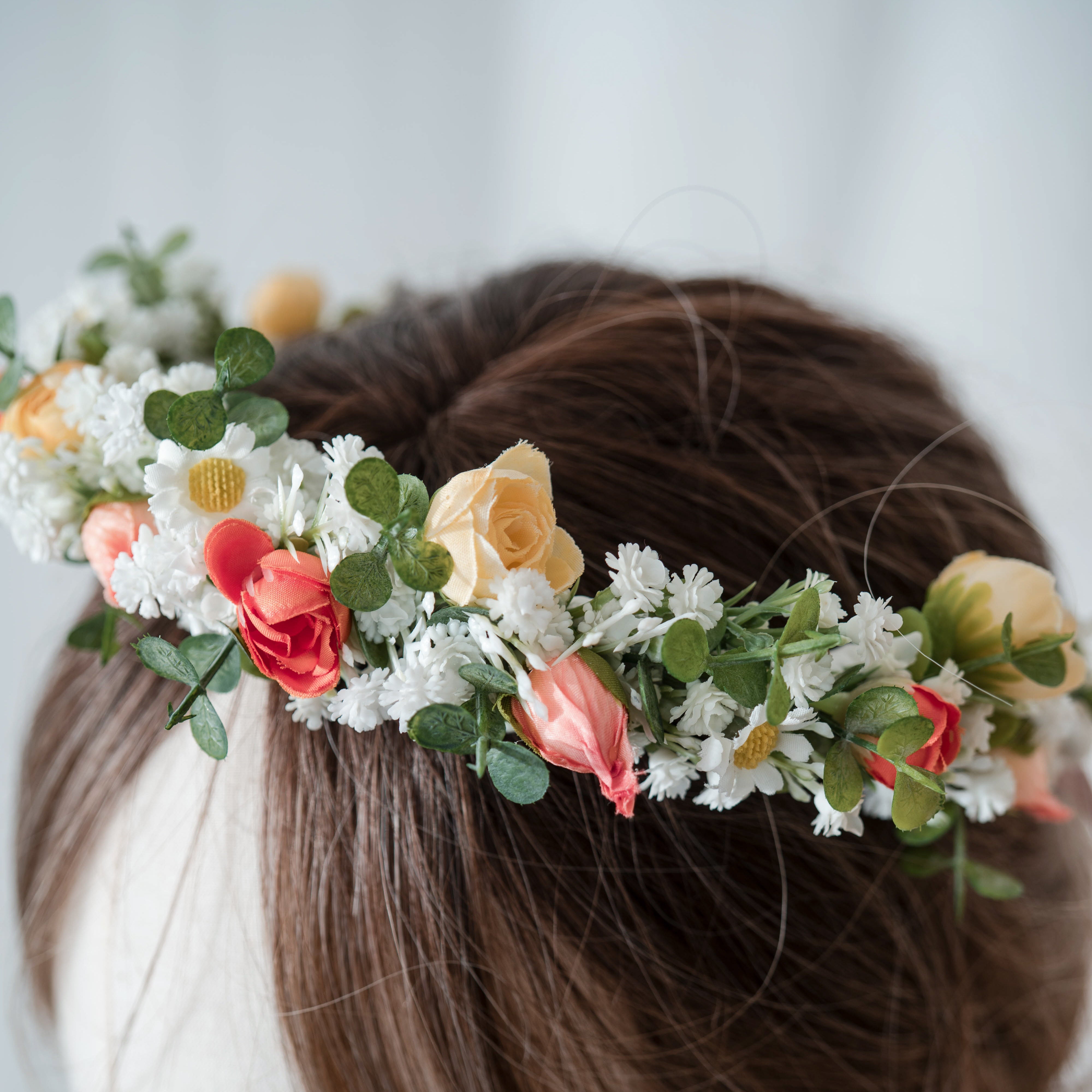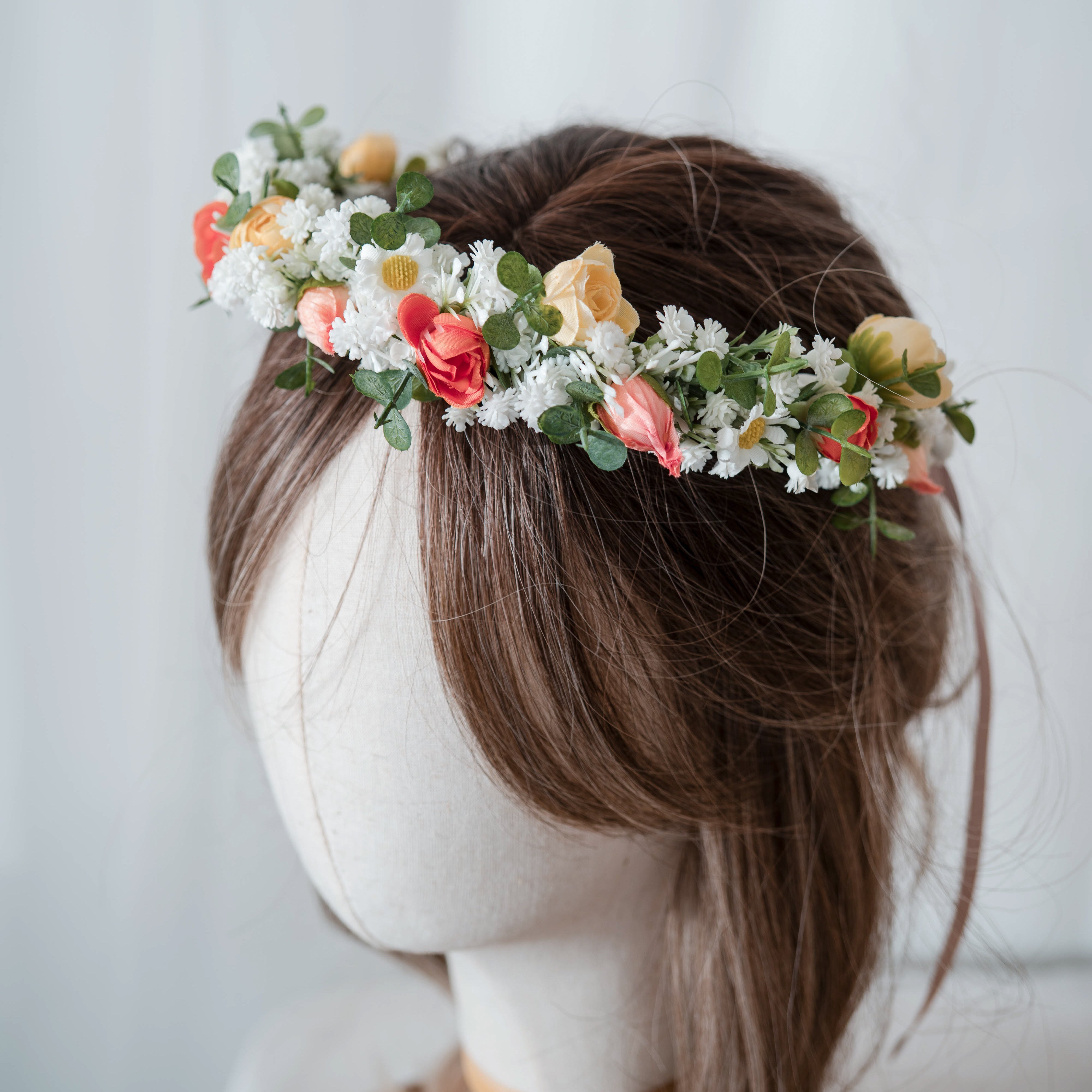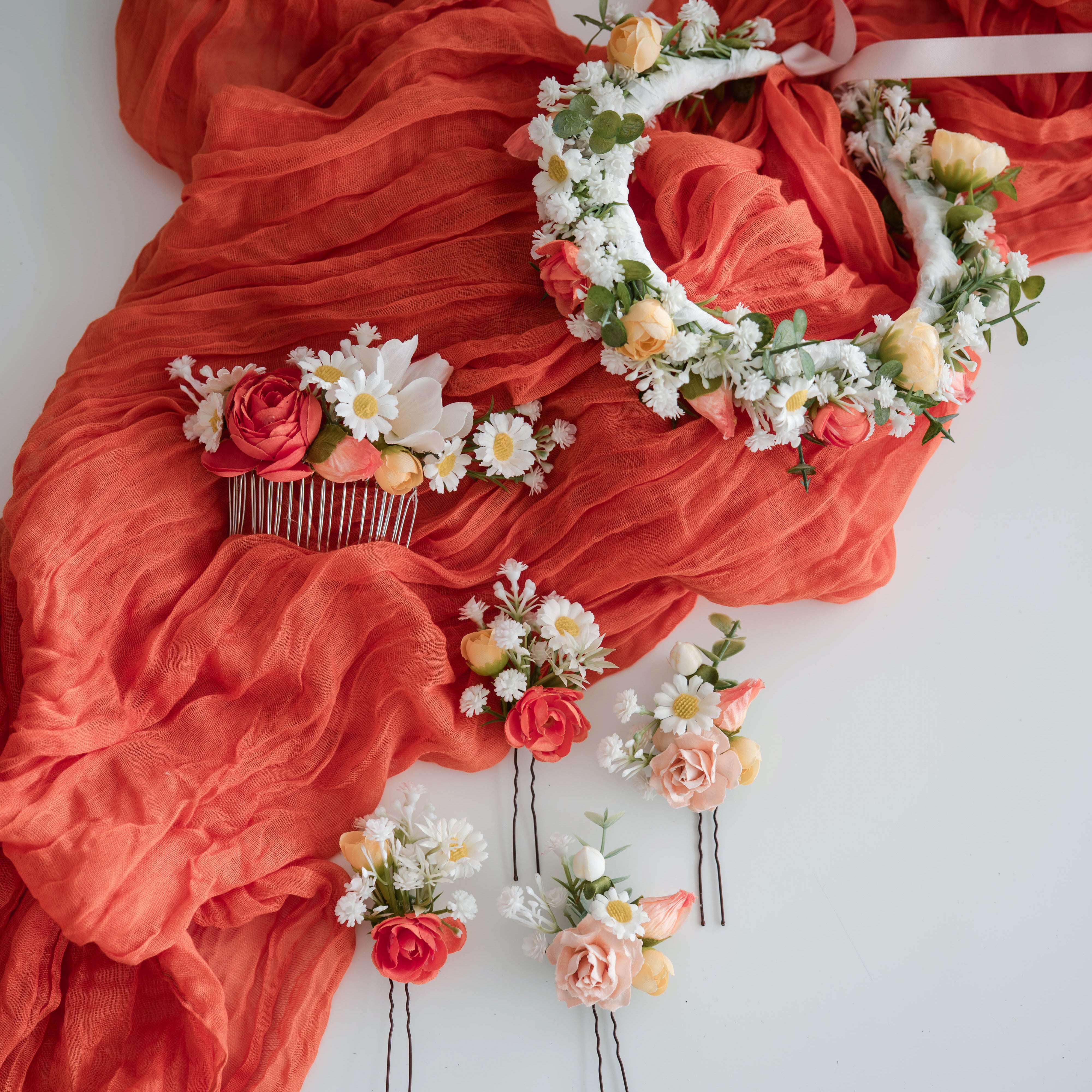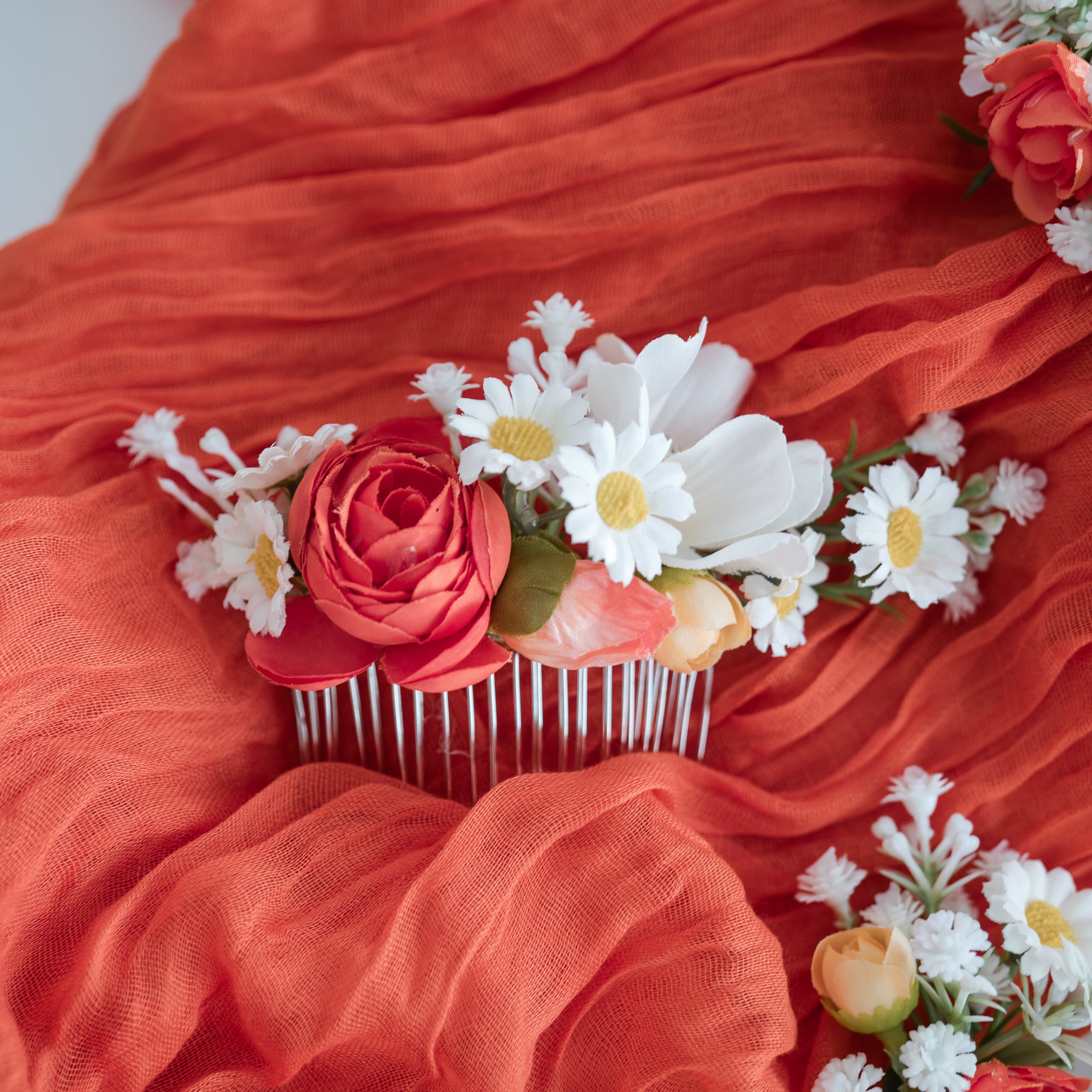 Sunlit Fresco - Orange Pink Ranunculus, Rose Flower Crown, Hair Comb, Pins