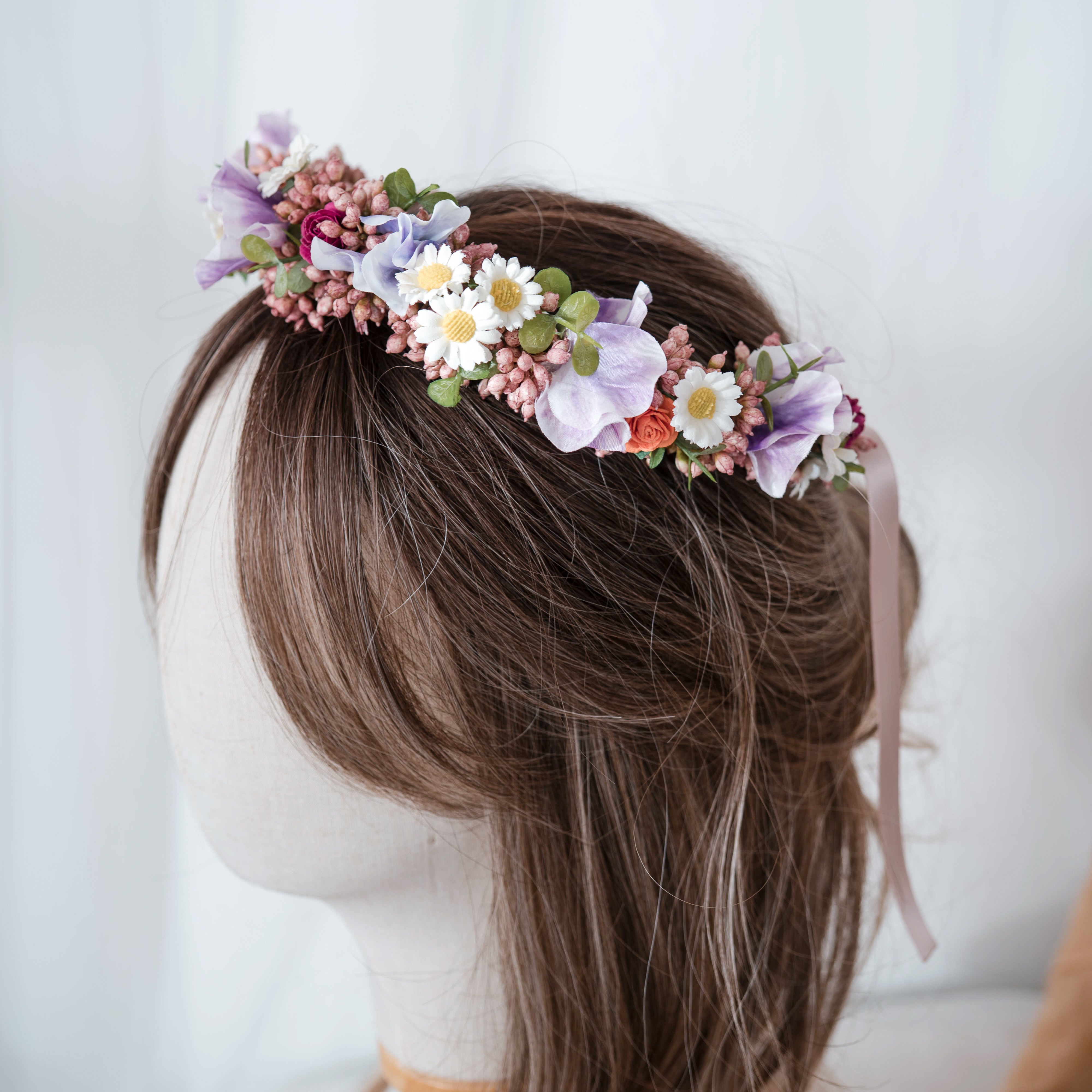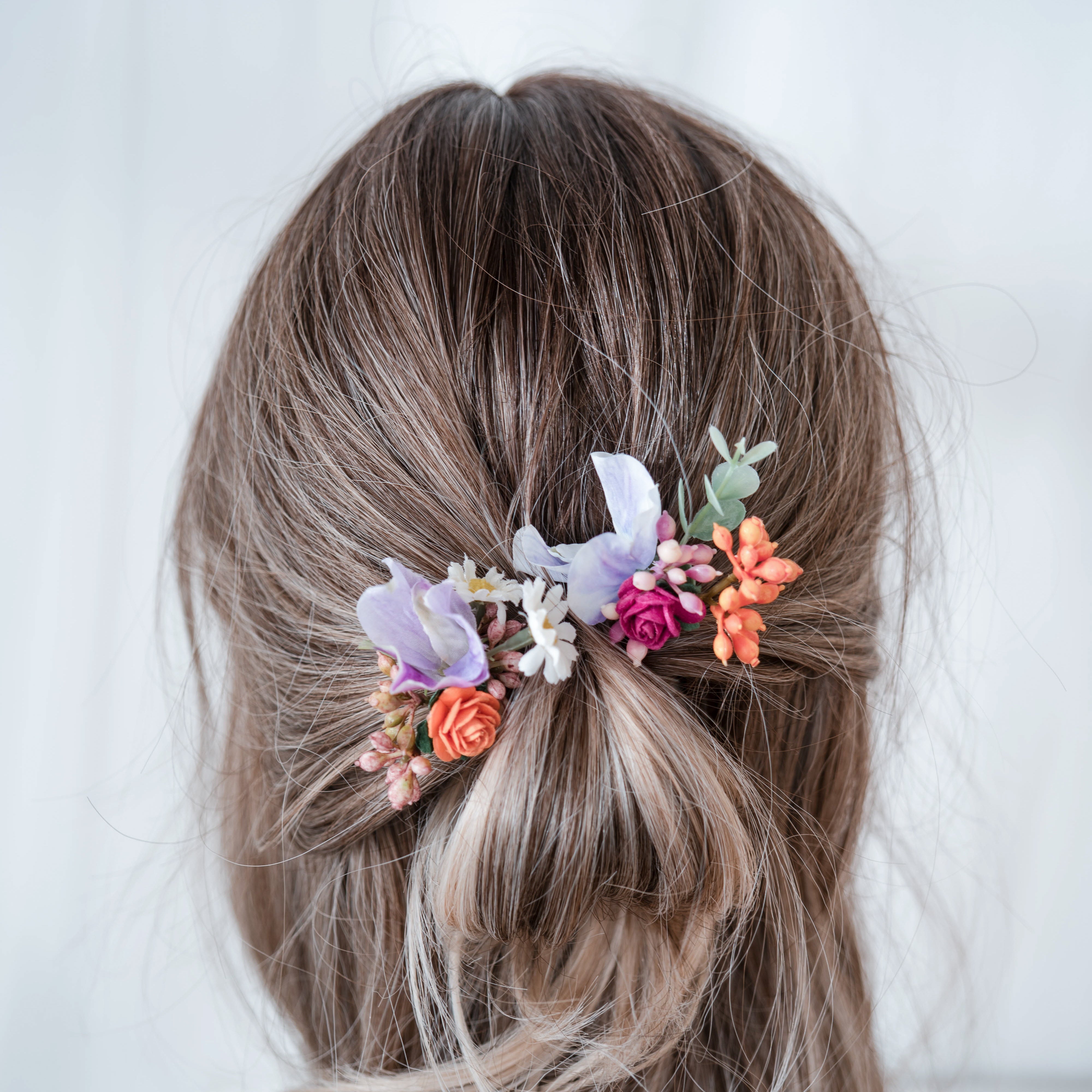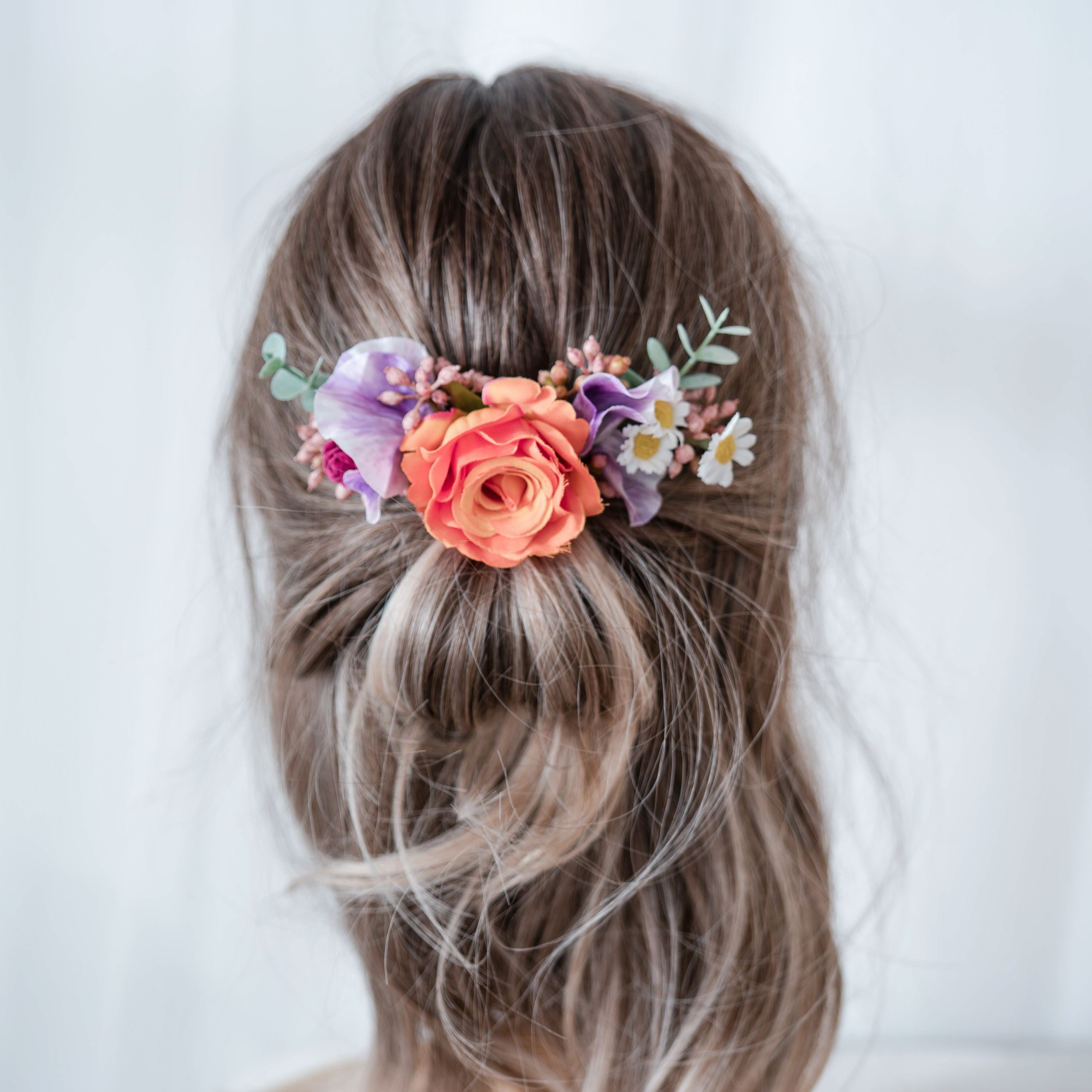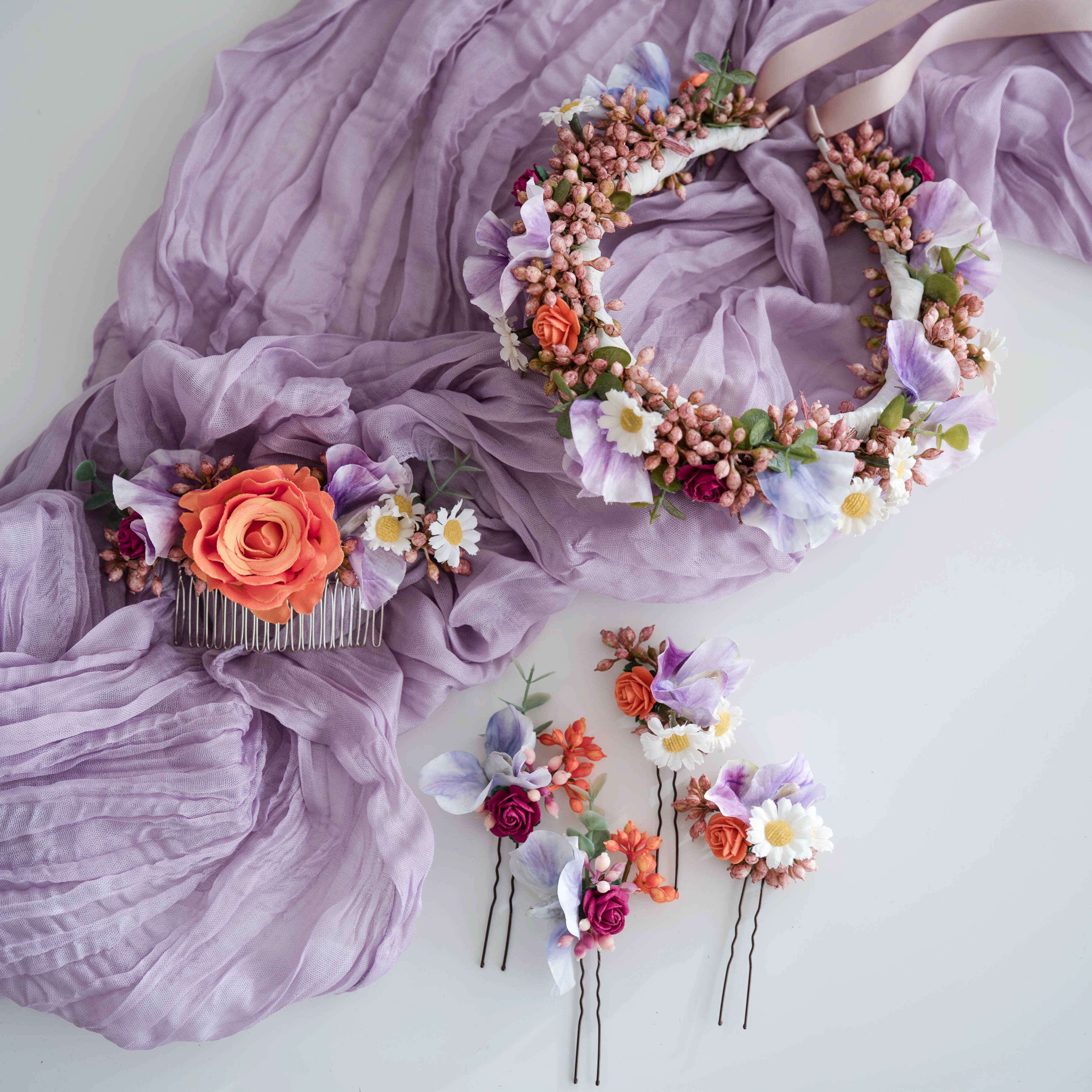 Tropical Sunset - Flower Crown with Hot Pink Peonies, Bright Orange & Purple Sweet Pea Comb + Pins
