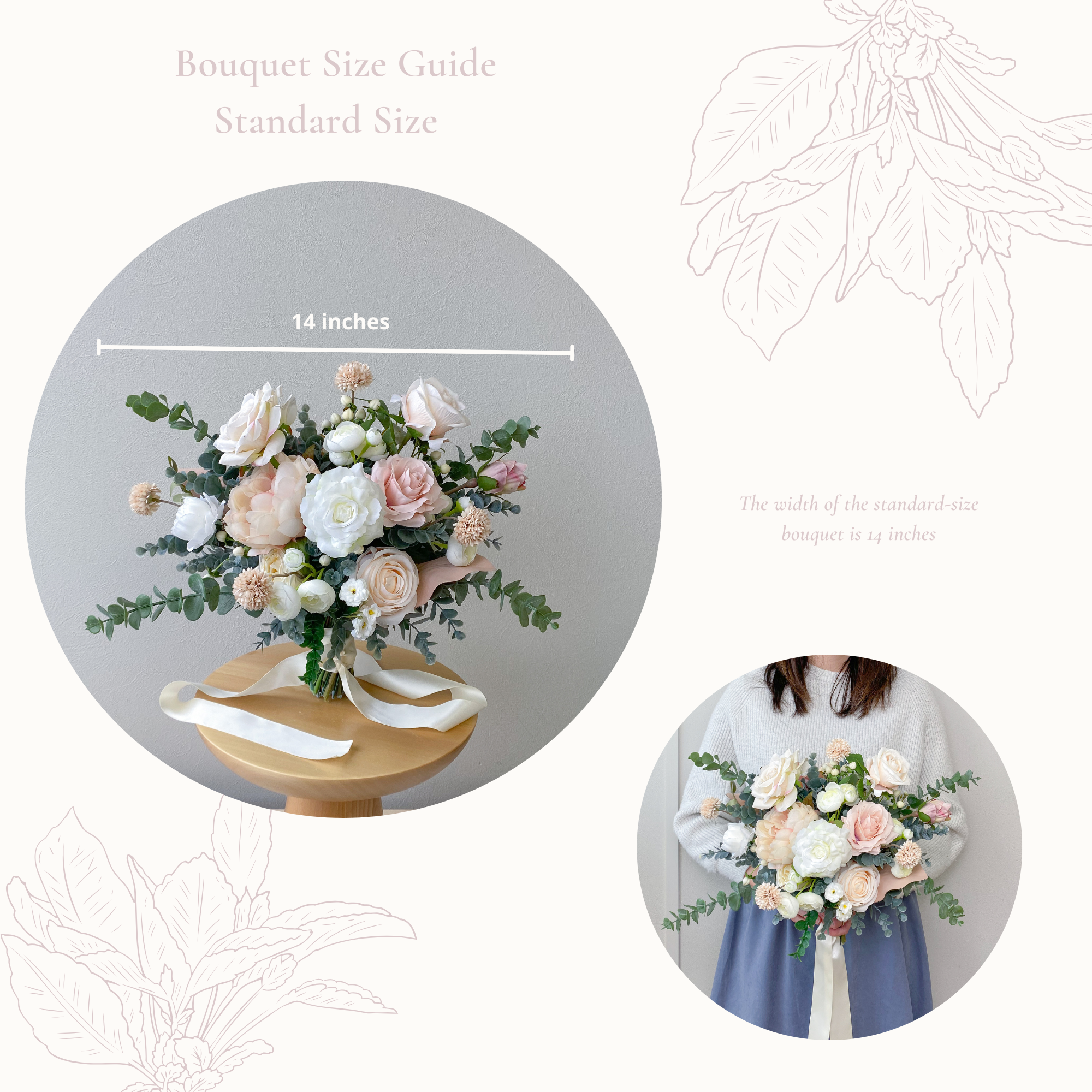 We offer four size options for this bouquets. The product photos showcase a standard size bouquet. For more precise measurements, please refer to our bouquet size guide.