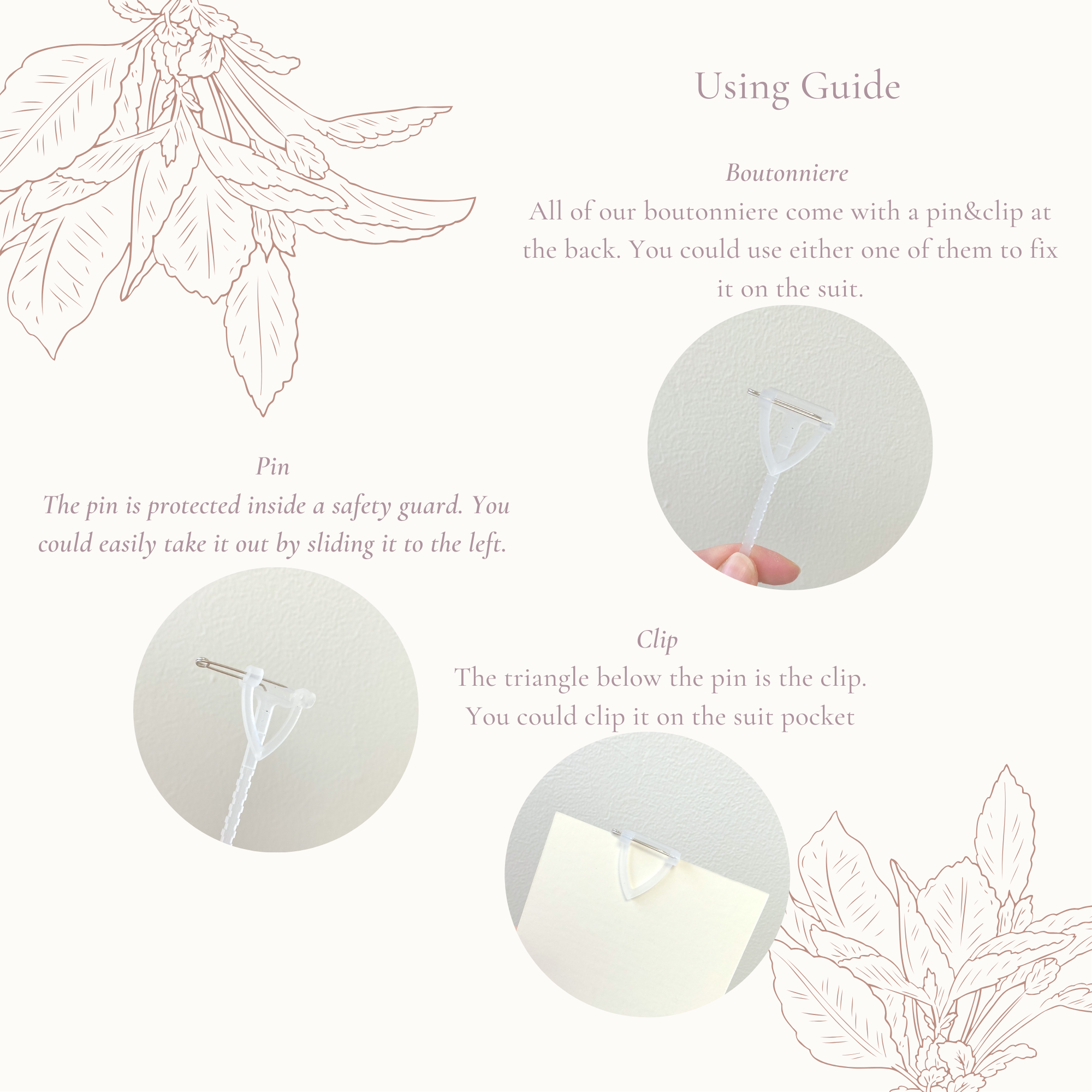 All boutonnieres come with a pin & clip, which makes it easy to fix on the suit.
