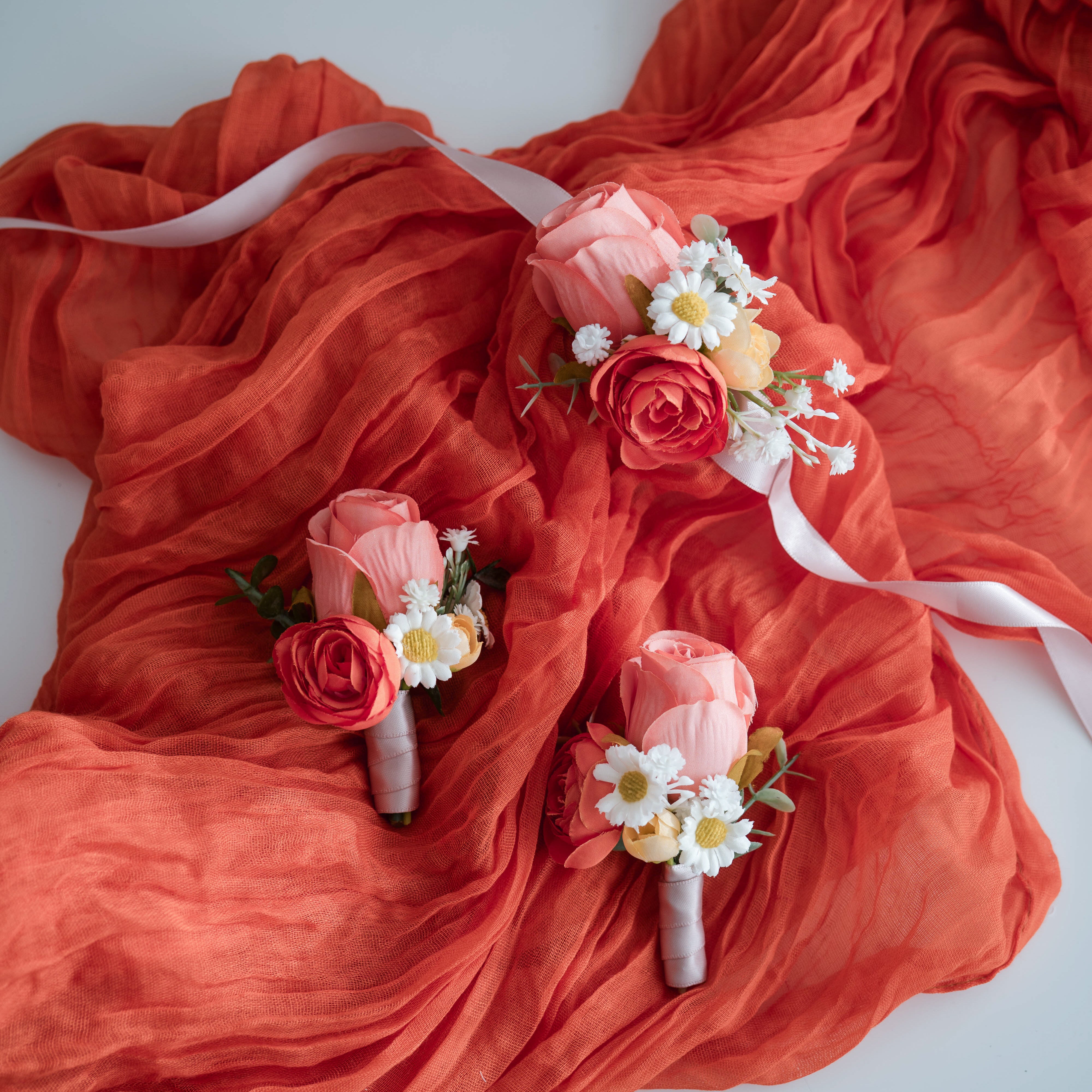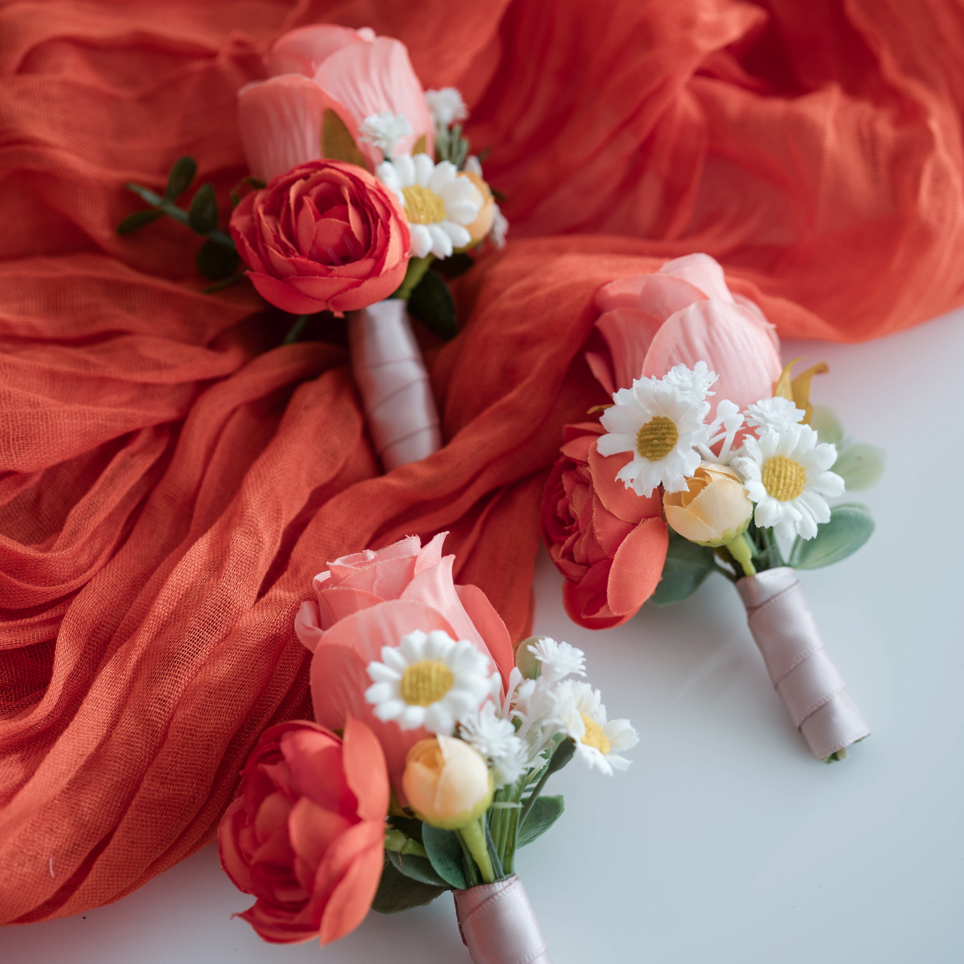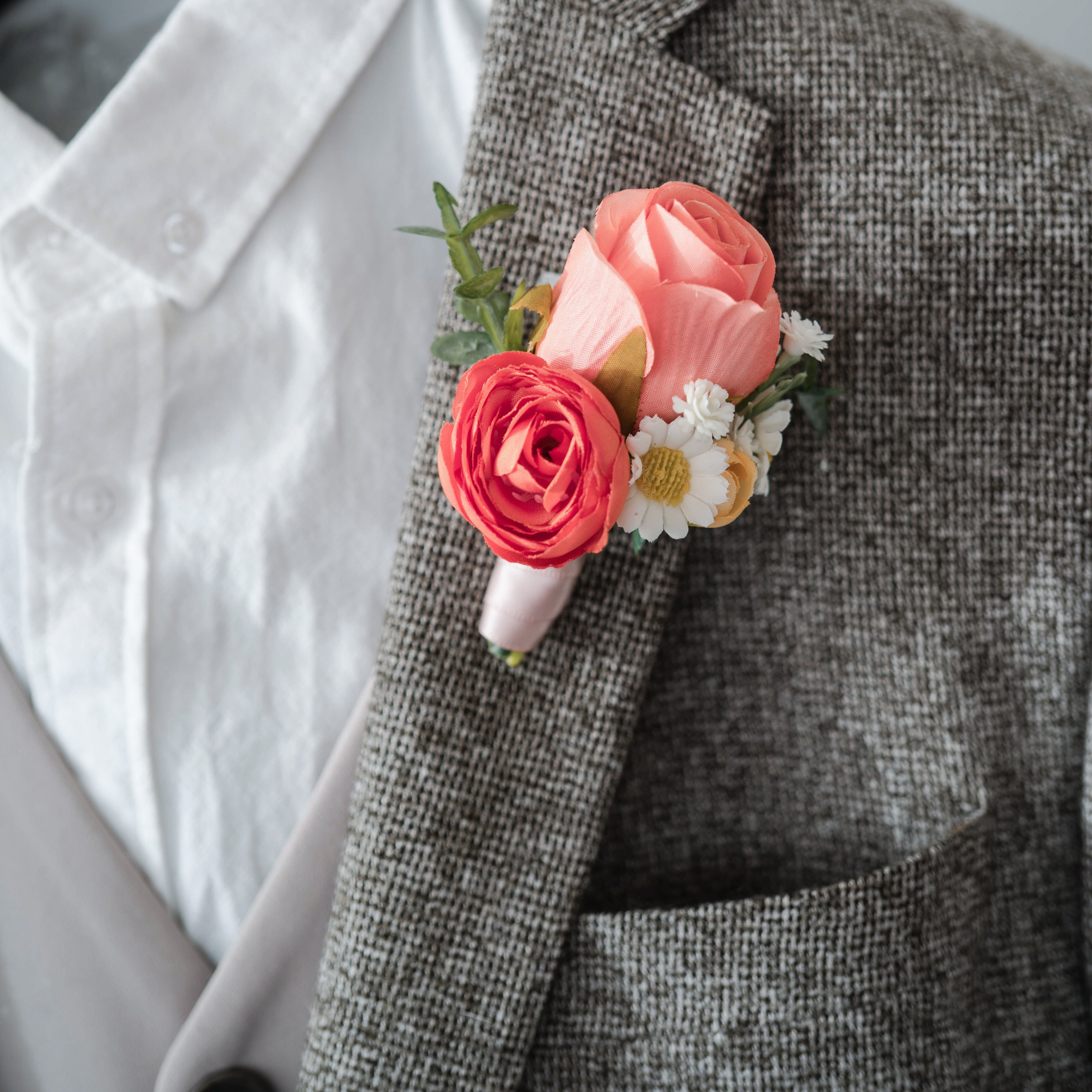 Sunlit Fresco - Orange Pink Ranunculus, Rose Buttonhole, Corsage, Pocket Square